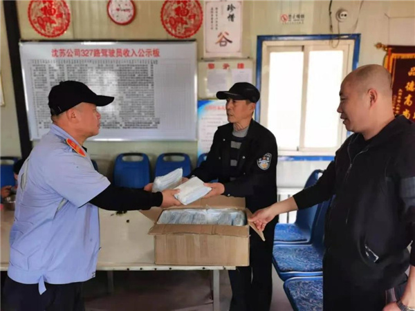 5月1日一早,王大爺帶著一箱口罩來到了沈蘇公司327車隊。