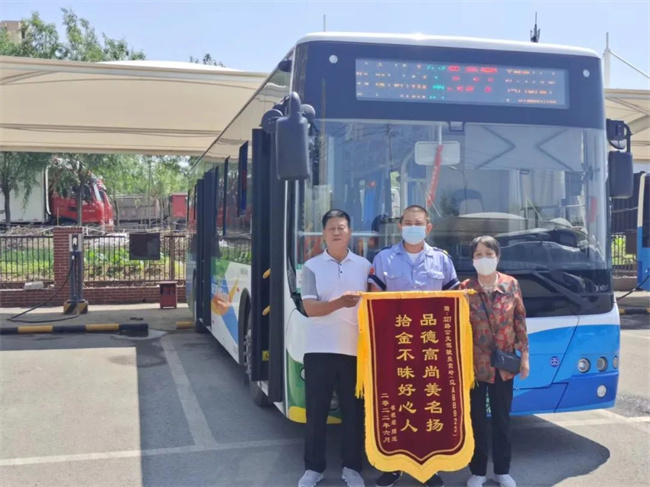 6月20日上午,市民崔女士將一面“品德高尚美名揚,拾金不昧好心人”的錦旗送到了沈蘇公司327路碧桂園終點站站務室,并當面對327路駕駛員高嶺表示再次感謝。