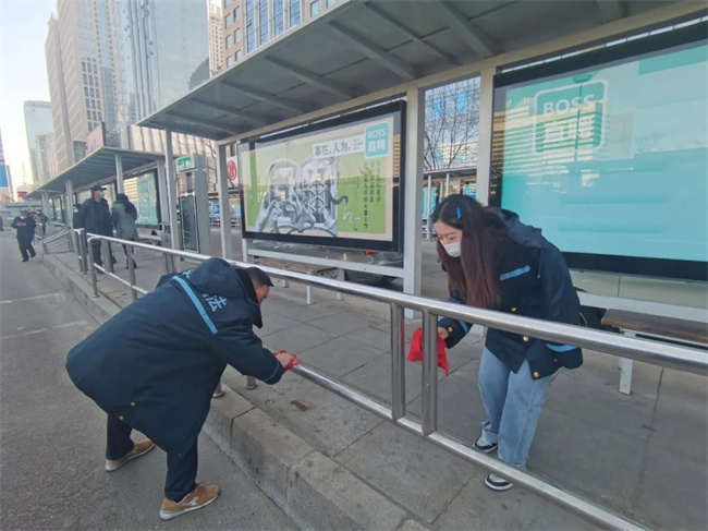 活動中,志愿者們?yōu)閬硗每椭敢较颍蜕蠠犸?,并拿起掃把、鐵鍬等工具對垃圾、落葉等進(jìn)行清掃、分裝、清運(yùn),對公交護(hù)欄、電子站牌等衛(wèi)生死角進(jìn)行全面清理,使樞紐站內(nèi)環(huán)境衛(wèi)生煥然一新。