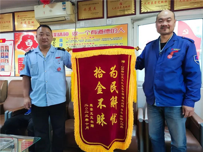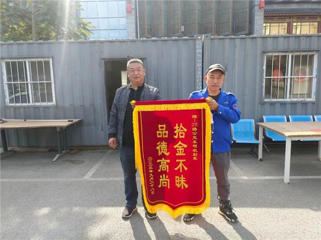 10月7日,一名乘客帶著寫有“拾金不昧 品德高尚”的錦旗來到211.222路車隊,以此表達對駕駛員彭軍的感激之情。